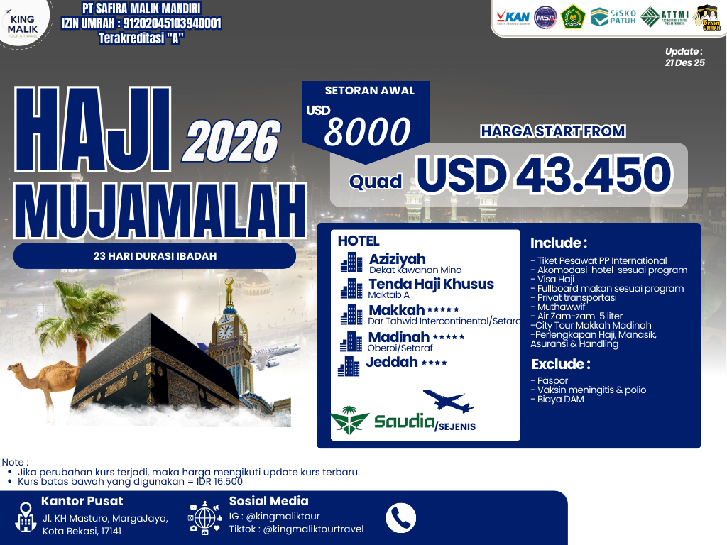 - Harga dapat berubah sewaktu-waktu sesuai dengan Kurs Dollar terhadap rupiah dan/atau berdasarkan kebijakan pemerintah Arab dan Indonesia