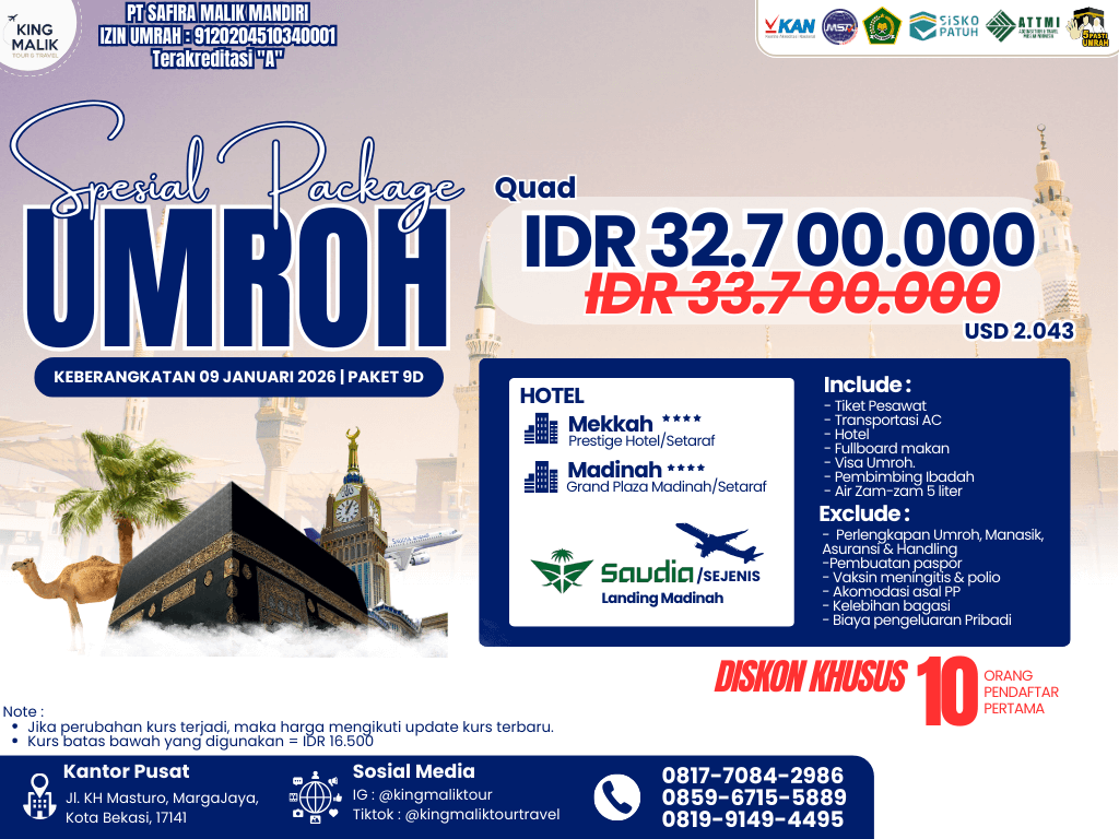 - Harga dapat berubah sewaktu-waktu sesuai dengan Kurs Dollar terhadap rupiah dan/atau berdasarkan kebijakan pemerintah Arab dan Indonesia