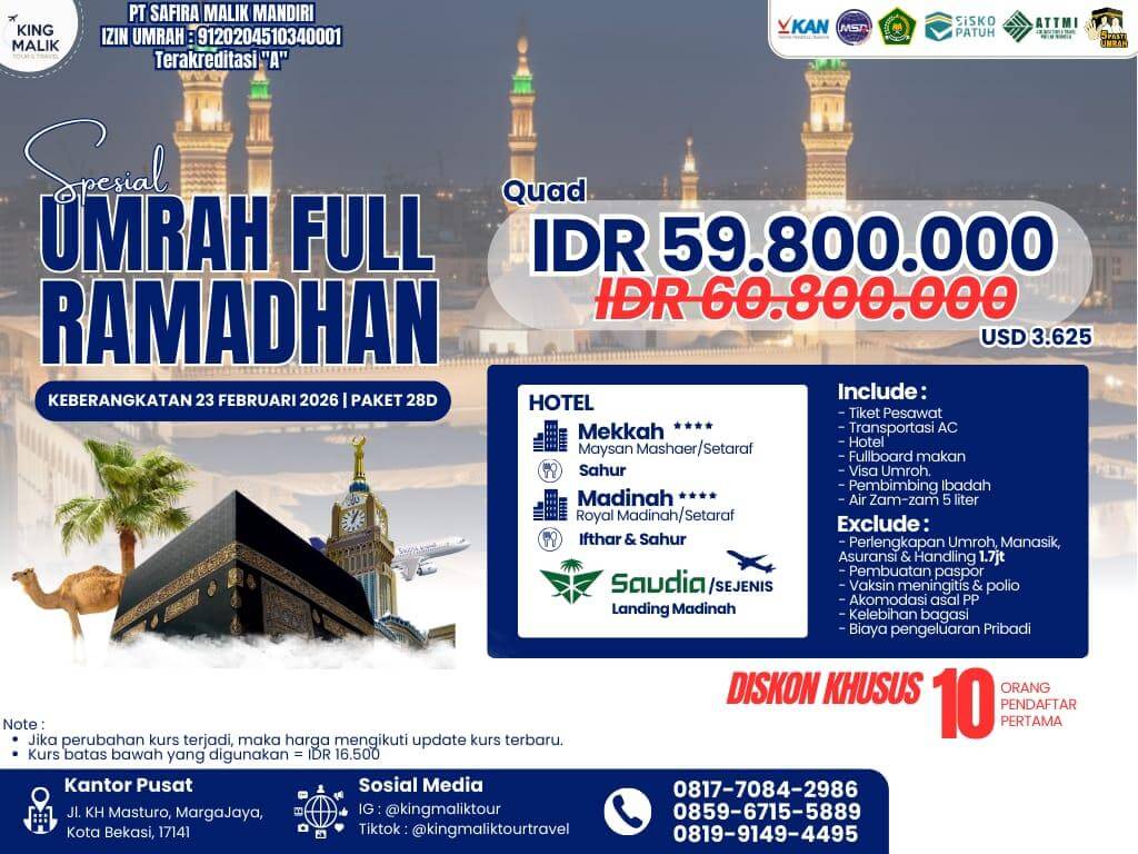 - Harga dapat berubah sewaktu-waktu sesuai dengan Kurs Dollar terhadap rupiah dan/atau berdasarkan kebijakan pemerintah Arab dan Indonesia