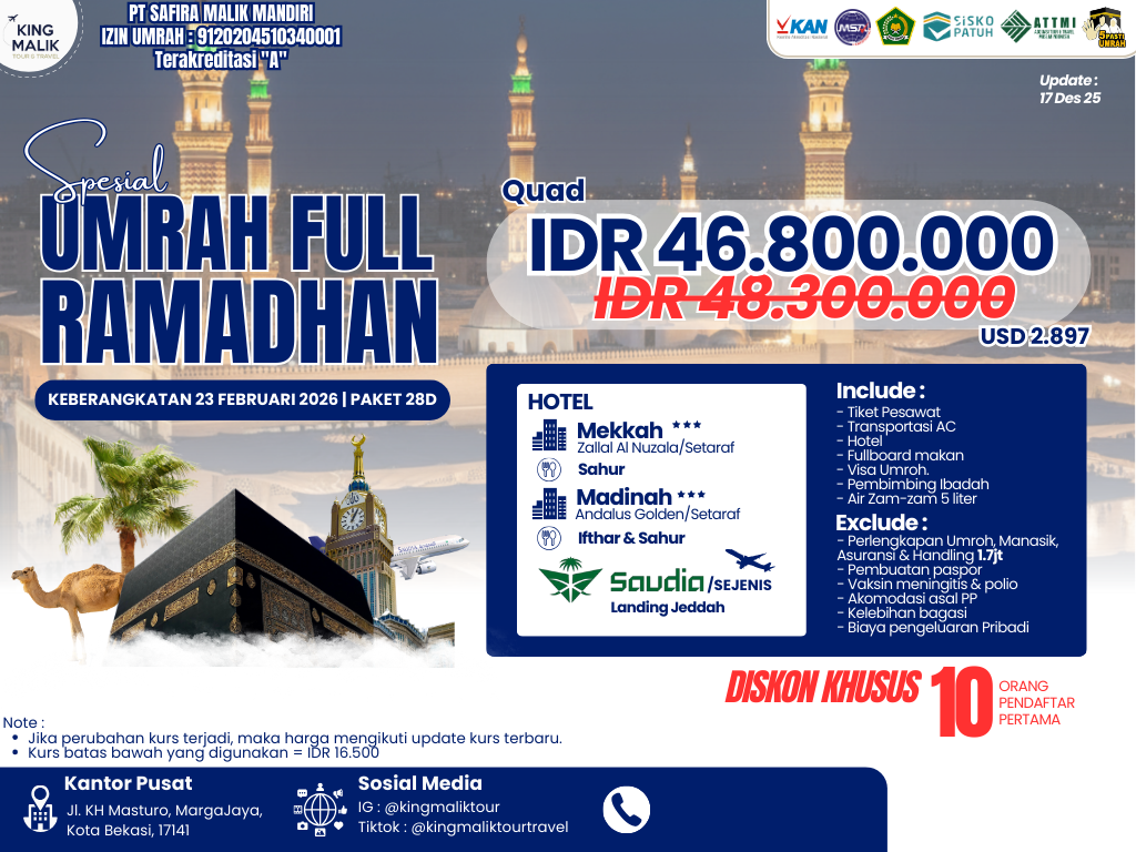 - Harga dapat berubah sewaktu-waktu sesuai dengan Kurs Dollar terhadap rupiah dan/atau berdasarkan kebijakan pemerintah Arab dan Indonesia