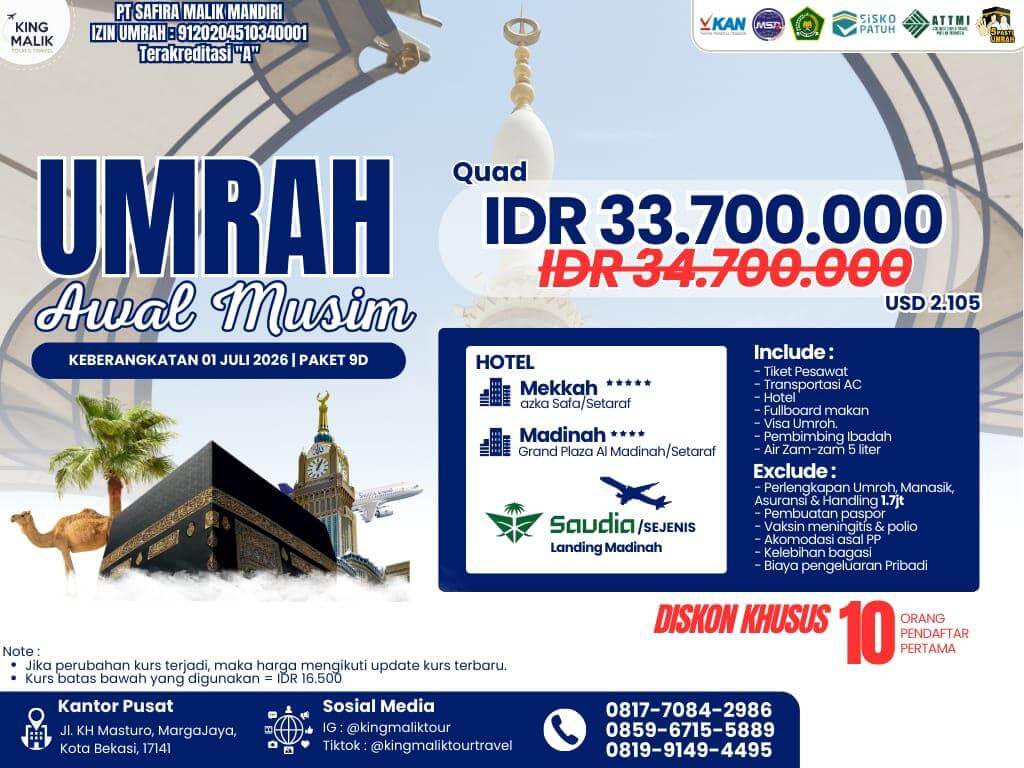 - Harga dapat berubah sewaktu-waktu sesuai dengan Kurs Dollar terhadap rupiah dan/atau berdasarkan kebijakan pemerintah Arab dan Indonesia