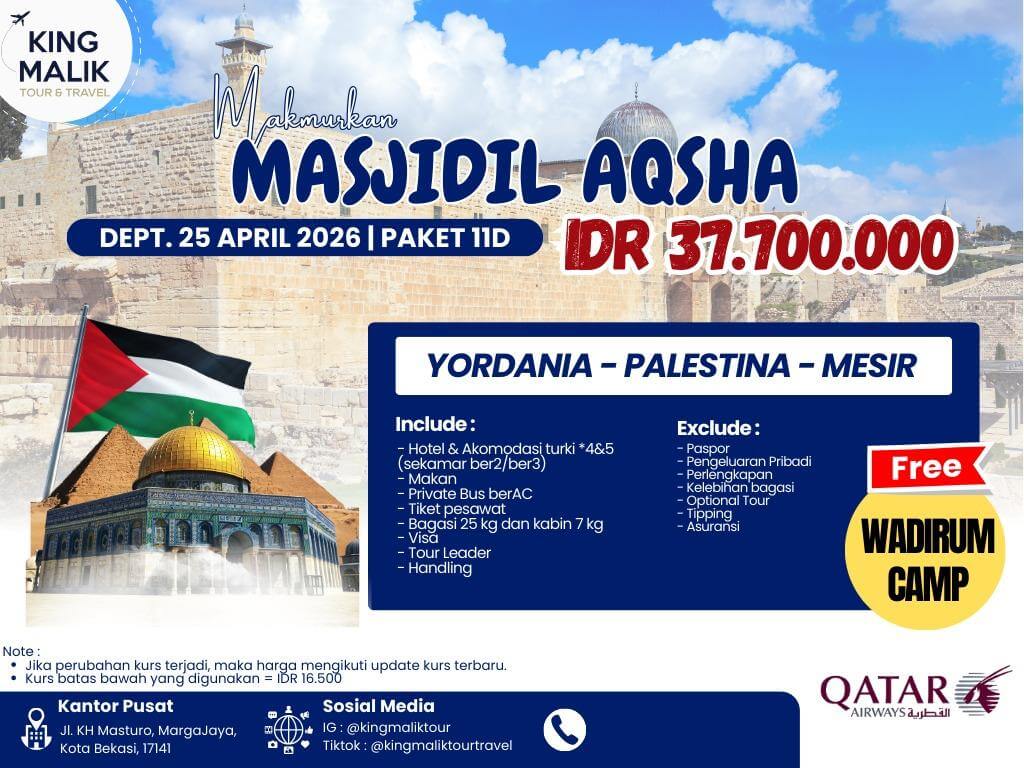 Kompleks Masjid Al Aqsa (Masjid Al Qibli, Qubbat as Sakhrah / Dome of the Rock, Masjid Al Buraq, Musholla Al Marwani, Babur Rahmah), Panoramic View of Masjid Al Aqsa, Makam Nabi Ibrahim dan Keluarganya, Jejak Nabi Musa, Jericho, Mount of Temptation, The Walls of Jerussalem, Tembok Ratapan, Souvenir Shop, Dead Sea dan Dead Sea Cosmetic Shop