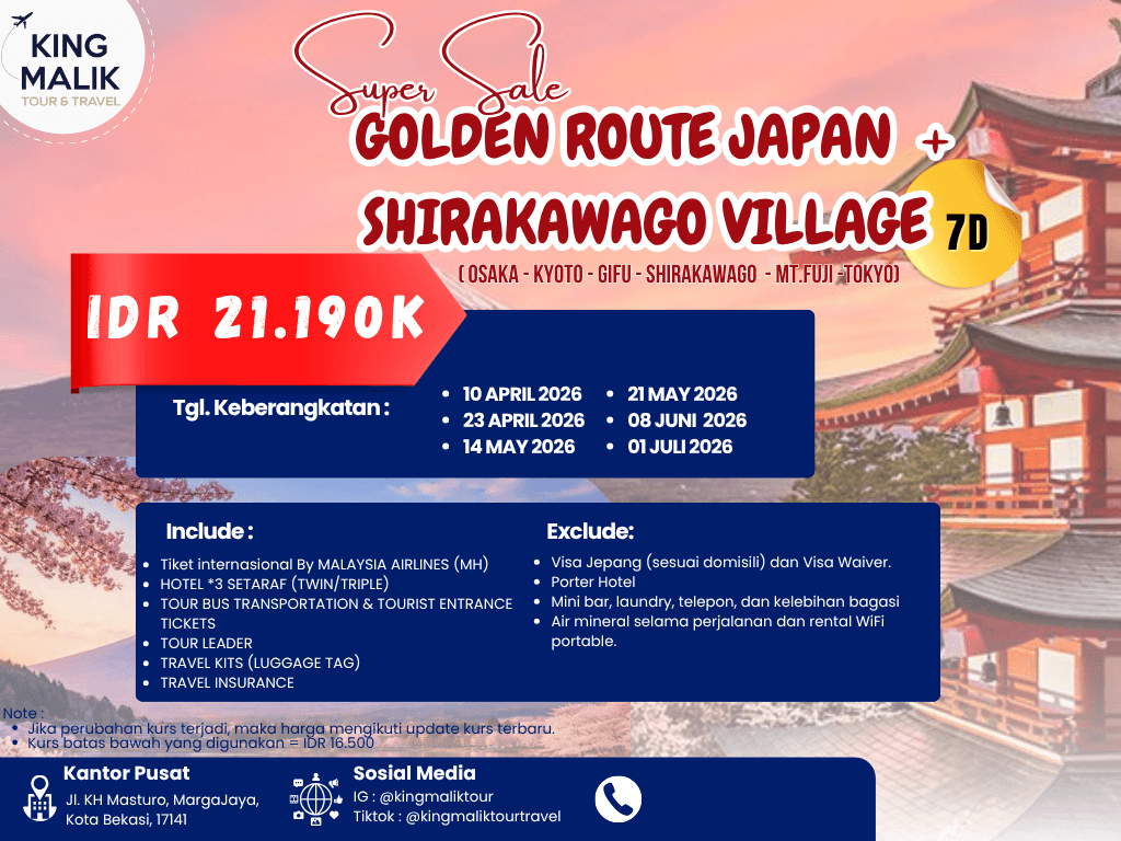 - Harga tour bersifat all-in (termasuk pajak internasional).